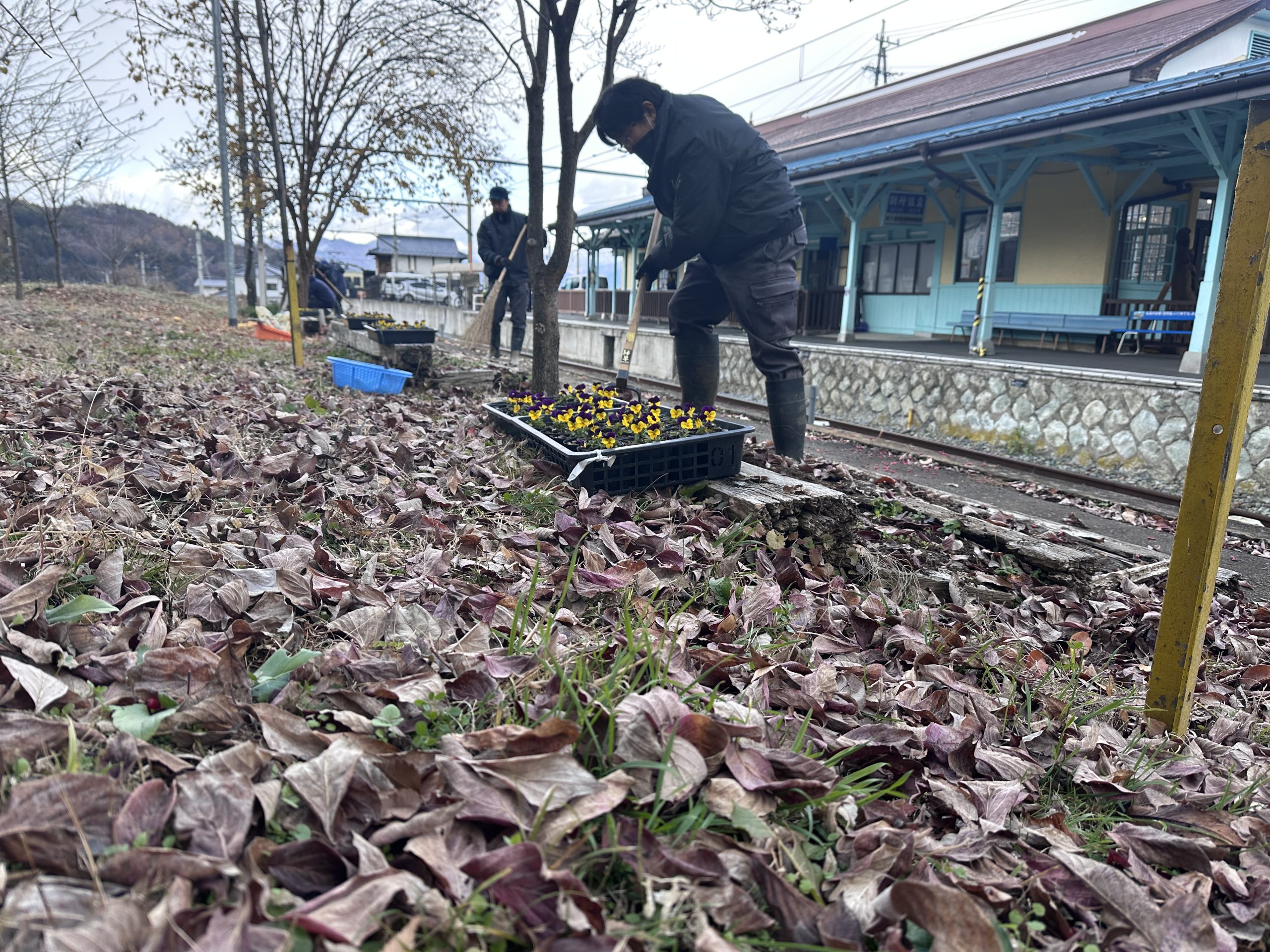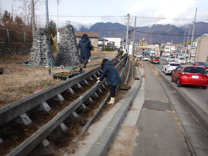2025年12月5日(金)、別所温泉駅の花壇と川辺町ポケットパークに黄色と紫色のビオラの苗を植えました。